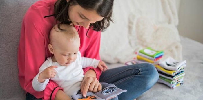 Di bulan-bulan awal, ajak bayi bicara, membaca dan bernyanyi untuknya. Pada usia 3-6 bulan, bayi mulai menikmati melihat cermin dan gambar wajah, bentuk, warna. Dia akan mulai membuat suara, menjangkau dan menyentuh gambar. Pilih buku dengan gambar dan tekstur yang menarik.
