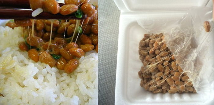 Natto terbuat dari biji kedelai yang difermentasi dengan Bacillus subtilis, biasanya dimakan untuk sarapan.