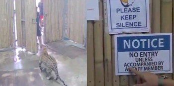 Melihat macan tutul di depannya, dia mundur tetapi membiarkan pintu terbuka lebar. Macan tutul itu pun berlari ke arah pintu yang terbuka dan membuat orang-orang di luar kandang menjadi panik.