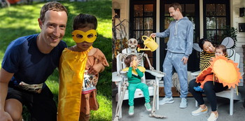 Seperti keluarga Amerika lainnya, Mark Zuckerberg, Priscilla, dan kedua anaknya juga ikut merayakan Hari Halloween. Di foto ini, terlihat Mark memakai kostum tulang, Priscilla kostum penyihir, serta kedua anaknya dengan kostum hantu dan labu.