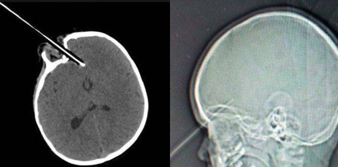 Saat itulah ia tersandung di tangga sambil memegang pensil. Seperti yang terlihat pada hasil foto sinar X, pensil tajam tersebut menikam matanya dan kemudian menembus sepanjang hampir 4 cm di bagian depan otaknya.