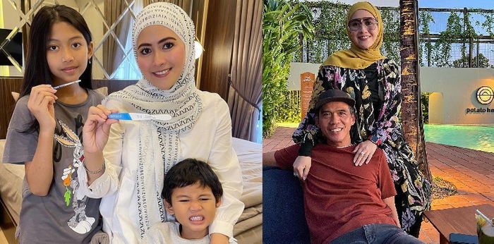 Dalam unggahannya, perempuan kelahiran 1980 itu tampak ditemani kedua anaknya sambil memperlihatkan bukti test positif hamil kepada publik.