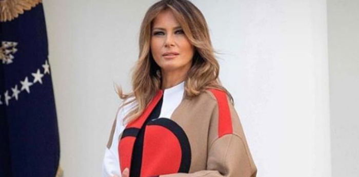Melania Trump mengenakan busana hitam yang dipadukan dengan mantel yang merupakan koleksi pra-musim gugur 2018, yang dirancang oleh Maria Grazia Chiuri. Mantel yang berhias aksen geometris yang dibuat oleh rumah mode Dior.