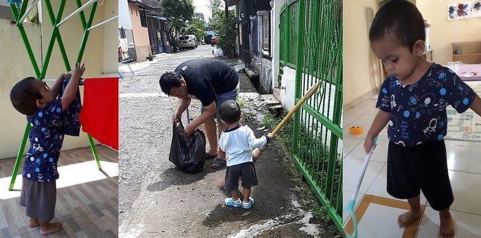 Saya sendiri tidak pernah menyuruh anak saya untuk menata sepatunya di rak sepatu, memintanya untuk membantu saya menyapu atau mengepel lantai, akan tetapi ketertarikan itu muncul dengan sendirinya Ketika usia anak saya menginjak 1.5 tahun. Ia ingin terlibat aktif dalam aktivitas yang berkaitan dengan pekerjaan rumah.
