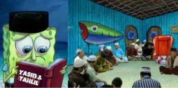 Dalam aksi berbalas meme berikut, meninggalnya Stephen diperingati Bikini Bottom dengan cara Islam ala Indonesia, yakni dengan tahlilan.