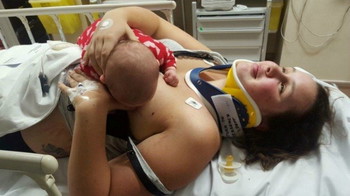 Dia lantas mengambil foto mereka dalam kondisi sulit ini: ibu terbaring di ranjang rumah sakit dengan penyangga leher, mencoba menenangkan bayinya dengan menyusui.