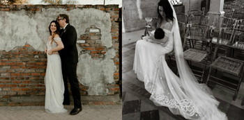 Pengantin perempuan ini memilih gaun sifon off-the-shoulder yang elegan tetapi juga membuatnya mudah untuk menyusui bayinya.