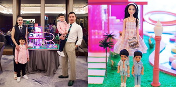 Bahkan dekorasi kue ulang tahunnya pun berupa boneka barbie yang mirip Sandra Dewi yakni Raphael dan Mikhael.