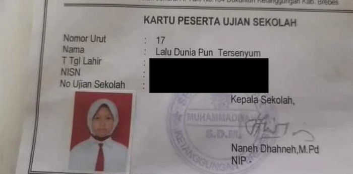 Bagaimana tidak, nama dari siswa tersebut adalah Lalu Dunia Pun Tersenyum. Sontak warganet pun berkomentar bahwa namanya serupa dengan lirik lagu atau pun puisi galau.