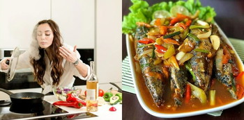 - Masukkan ikan, masukkan juga saus, garam, gula, dan kaldu jamur, tumis sebentar. Masukkan air, biarkan hingga meresap. Terakhir tambahkan daun kemangi, matikan api.