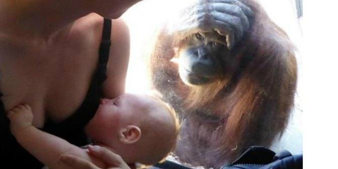 Menurut penelitian yang telah dilakukan, orangutan merupakan hewan yang memiliki kesamaan gen hampir 96,4 persen dengan gen manusia. Dan mamalia tersebut adalah makhluk hidup yang memiliki kecerdasan hampir menyamai manusia. Maka tidak mengherankan apabila terdengar kelakuan orangutan yang terlihat seperti manusia. Sama seperti pada ulasan ini, dimana terdapat seekor orangutan betina yang terlihat mengagumi seorang perempuan yang tengah menyusui bayinya.