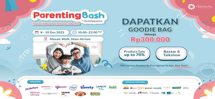 Nikmati juga berbagai promo serta bisa mencoba produk kebutuhan ibu dan anak gratis dari theAsianparent dan mendapat goodie bag serta penawaran menarik dari para sponsor seperti Pediasure, Prudential Syariah, Imboost Kids, Cussons Baby, Sweety, Lactacyd Baby, Asifit, Mama’s Choice, KoinWorks, Sakatonik ABC, Cerebrofort Gold, dan Sidomuncul.