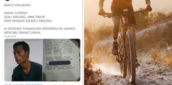 “Bantu viralkan!! Nama: Sutikno. Asal: Malang, Jawa Timur. Dari Yayasan SLB Batu Balang. Ia seorang tunawicara bersepeda ke Jakarta mencari orang tuanya,” tulis @ruddierawk.