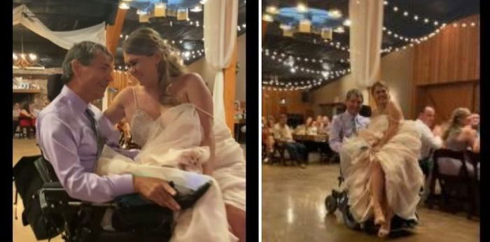 Melalui unggahannya itu, Dakota menunjukkan momen haru sang saudari menari dengan ayahnya di atas kursi roda. Sang pengantin yang diketahui bernama Tenaya tersebut duduk di pangkuan sang ayah.