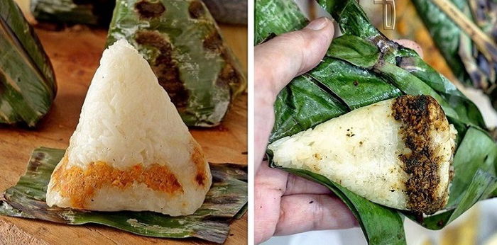 - Ambil selembar daun pisang, bentuk kerucut, lalu masukkan adonan ketan sedikit ke dalamnya. Beri ebi di bagian tengahnya, masukkan lagi ketan dan bungkus membentuk kerucut, rapikan. Lakukan hingga semua ketan dan ebi habis.