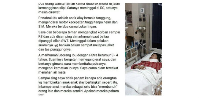 Pagi ini saya dikagetkan dengan kabar dari seorang sahabat yang dirawat intensif di ICU. Terdapat memar otak dan tulang pangkal lehernya retak akibat ditabrak motor. Sedihnya lagi, salah satu korban tabrak lainnya sampai meninggal dunia. Almarhumah adalah ibu dari seorang anak berusia 3-4 tahun. Betapa sedih melihat kebahagiaan dan kasih sayang anak tersebut dari ibunya direnggut oleh pengendara tidak bertanggung jawab.