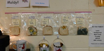 “Kami melakukan proyek sains di kelas ini bulan lalu saat musim flu mulai menjangkit. Kami mengambil roti yang masih baru dan menyentuhnya. Selembar roti dibiarkan tak tersentuh. Satu lembar roti disentuh oleh tangan yang tidak dicuci. Selembar lagi disentuh tangan yang dibersihkan dengan hand sanitizer. Satu lembar roti lagi disentuh dengan tangan yang dicuci dengan air hangat dan sabun. Roti yang terakhir digosokkan pada semua Chromebook kelas kami.”