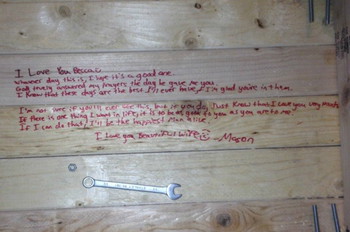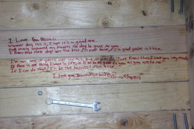Becca, istri pria romantis ini memang suka mengukir logam. Tampaknya ia yakin istri atau anaknya akan menemukan pesan mengharukan itu suatu hari nanti.