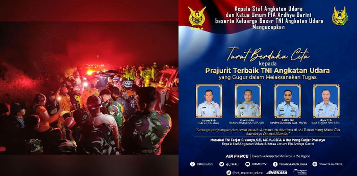 “Kepala Staf Angkatan Udara dan Ketua Umum PIA Ardhya Garini beserta seluruh keluarga besar TNI Angkatan Udara mengucapkan turut berduka cita kepada prajurit terbaik TNI Angkatan Udara yang gugur dalam melaksanakan tugas. Semoga perjuangan dan amal ibadah almarhum diterima di sisi Tuhan yang Maha Esa. Amin Ya Rabbal ‘Alamiin,” tulis akun resmi TNI AU militer.udara.