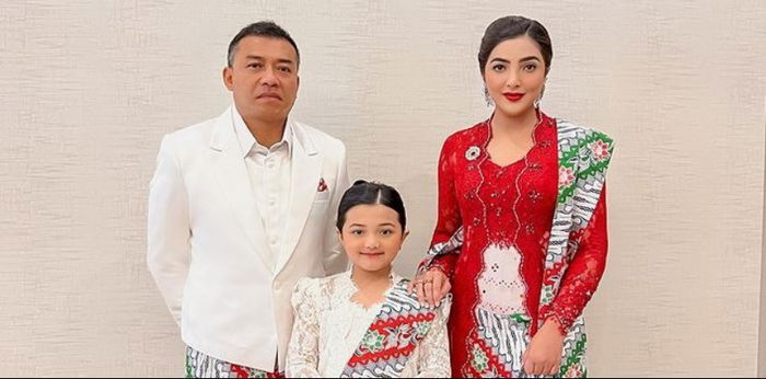 Mendukung putrinya bersaing di perlombaan internasional, keluarga Hermansyah pun kompak memilih pakaian tradisional rancangan Rika Wirtjes dengan dominasi warna ciri khas Indonesia yaitu merah dan putih.