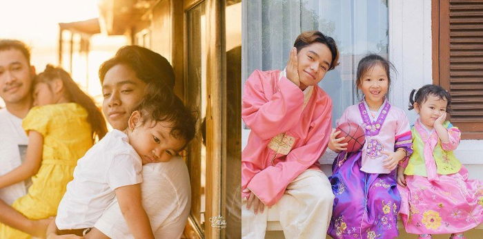 Betrand Peto, Thalia, dan Thania kompak mengenakan pakaian tradisional Korea. Foto mereka pun begitu manis meski hanya berpose ala kadarnya.