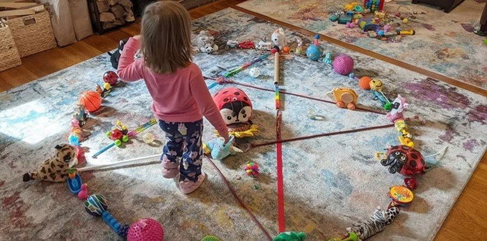 Bukannya seram, malah terlihat lucu dan menggemaskan. Anak kecil ini pasrah saja ketika kakak perempuannya memasukkannya ke dalam sebuah peti mainan yang dibuatnya sendiri dari karpet puzzle.
