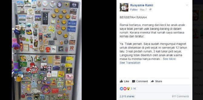 Melalui status Facebooknya, ibu asal Malaysia bernama Rusyainie Ramli ini menjelaskan bahwa penyebab utama mengapa ia memiliki rumah yang selalu rapi adalah anak-anaknya yang selalu disiplin dan tak pernah ‘nakal’.