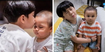 Duh, potret yang satu ini asli bikin meleleh, deh! Aa Rafathar memberikan kecupan sayang tepat di jidat Kiano. Reaksi si kecil berambut plontos yang tampak pasrah itu juga bikin senyum-senyum.