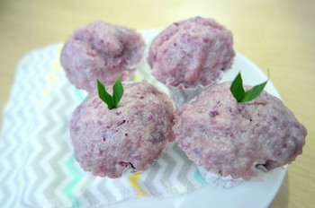 Muffin kukus ubi ungu, adonan sebelum dan sesudah dikukus.