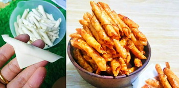 - Potong-potong kulit pangsit kotak kecil. Ambil 1 butir kacang tanah, letakkan di ujung kulit pangsit, gulung dan rekatkan dengan air tepung terigu. Lakukan hingga kacang tanah habis.