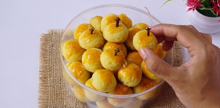 Kemudian, adonan dibentuk bulat-bulat dengan diameter sekitar 2 cm. Nastar sering dihias cengkih, kismis, maupun keju di atasnya.