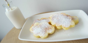 - Kocok telur dengan susu dan vanilla. Lalu tuang ke adonan tepung, aduk rata.