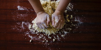- Masukkan tepung, garam, baking powder, yogurt, dan 2 sdm minyak ke dalam wadah. Campurkan dengan tangan hingga membentuk remah-remah