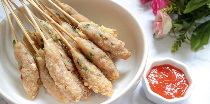 - Lumuri tangan dengan sedikit minyak sayur. Ambil 1 sdm penuh adonan lalu bentuk bulat panjang dan tusuk dengan tusuk sate.