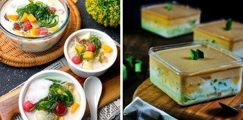 - Siapkan wadah dessert box. Isi dengan pandan cake di bagian dasar, kemudian cendol, dan vla santan. Biarkan sebentar sampai bagian atasnya agak mengeras.