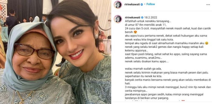Demikian Ririn ekawati bagikan kabar duka tentang sang nenek yang meninggal dunia. Semoga sang nenek diberikan tempat terbaik di sisiNya dan keluarga yang ditinggalkan juga diberi ketabahan, ya.