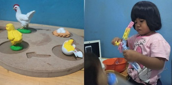 Kita bisa lakukan hal tersebut juga dirumah. Di dalam metode montessori, material yang ada hanya boleh berjumlah satu dengan maksud anak-anak akan belajar untuk bergantian memakainya. Disini banyak sekali pelajaran yang bisa mereka ambil.