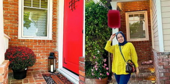 Tampak dari bagian depan rumah didominasi bata merah di seluruh tembok. Area pintu masuk pun terasa manis dengan adanya hiasan pot bunga, lampu lentera dan pintu berwarna senada. Sama seperti rumah-rumah bergaya Amerika pada umumnya, teras depan rumah memang tak begitu luas.