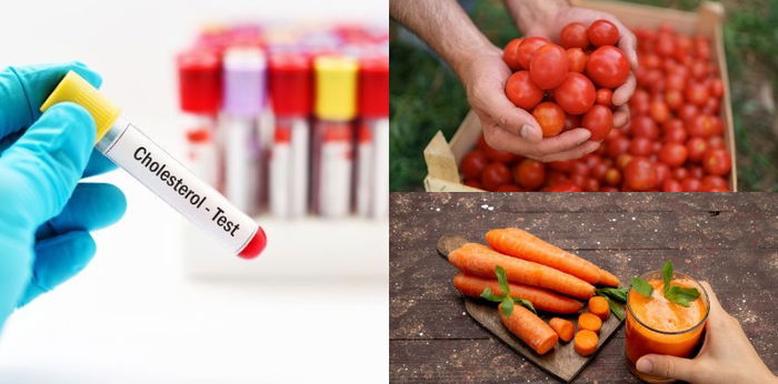 Tomat kaya akan vitamin antioksidan, salah satunya adalah likopen sangat ampuh menurunkan kadar kolesterol jahat yang tinggi dalam darah. Selain itu ada vitamin A, C dan kalium yang baik untuk tubuh.