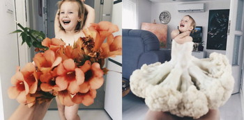 Alya Chaglar punya cara unik bagaimana memanfaatkan sayuran, buah, bunga, dan cabai. Benda-benda tersebut dipakai sebagai atribut sesi foto baju unik dengan anaknya, Stefani (3).