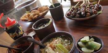 Soto gerabah pas disantap dengan tempe mendoan, perkedel, sate telur puyuh, sate ati ampela, usus, tempe garit, sate ayam, tahu yang dibandrol sekitar Rp2.000 per satuannya.