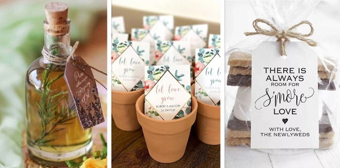 Dari pada buang-buang uang, lebih baik memilih souvenir yang pasti disukai banyak orang saja, yakni makanan atau minuman. Seperti cookies, kopi giling, chocolate bar, permen lollipop, saus sambal botol, atau lainnya. Kalaupun Anda tidak menyukainya, masih bisa dinikmati orang lain. Anda tinggal menuliskan nama Anda dan pasangan pada kemasan.