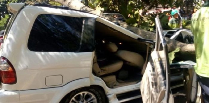 Ia mengatakan angin pada siang itu bertiup cukup kencang sehingga pohon yang tumbang tersebut sempat terangkat dan menimpa mobil.