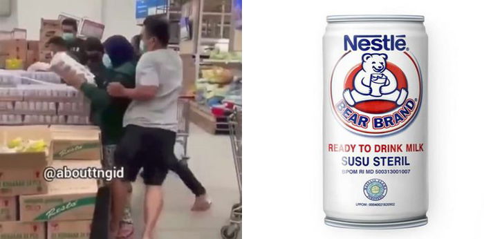 “Terpantau sedang rebutan susu,” cuitnya pada video yang memperlihatkan kerumunan orang berebut susu beruang di sebuah swalayan. Bahkan kerumunan tersebut menimbulkan kericuhan ketika para pembeli saling mendorong dan menyikut agar dapat membawa pulang susu kaleng itu.