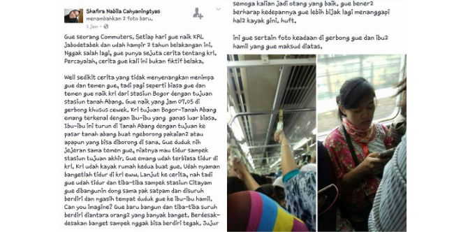 Namun, seorang wanita bernama Shafira Nabila Cahyaningtyas mengumpat di Facebook karena merasa terpaksa menyerahkan tempat duduknya saat di KRL kepada ibu hamil.