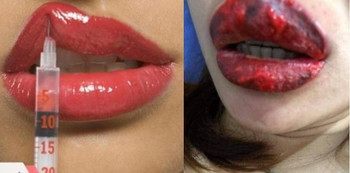 Bukannya mendapatkan bibir dengan warna merah merona, setelah melakukan tato bibir, bibirnya justru menjadi bengkak, bahkan hingga menimbulkan luka yang berujung pada kondisi koreng yang mengerikan. Ternyata, produk yang disuntikan ke dalam bibir diketahui palsu.