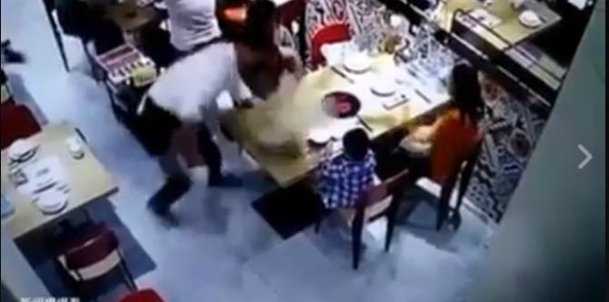 Sebuah kamera CCTV merekam kejadian mengerikan. Seorang anak tersiram air panas karena pelayan terpeleset saat membawa kuah mendidih di mangkok.