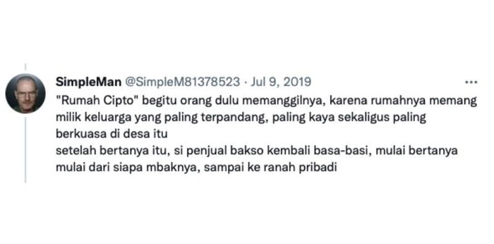 Kesuksesan film KKN di Desa Penari yang tengah menarik animo masyarakat tidak lepas dari kepiawaian sang penulis, SimpleMan. Seorang anonim dengan akun Twitter @simpleM81378523 ini selalu menghibur dengan berbagai thread atau utas yang menguji keberanian Anda.