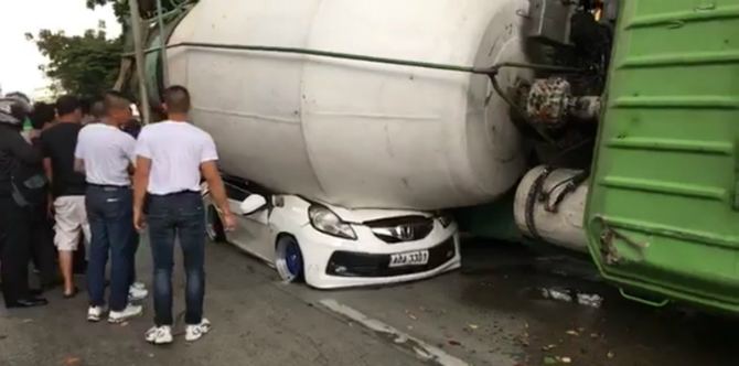 Sebuah truk molen yang melintas di jalan Mindanao Avenue, Quezon City, Filipina oleng dan menimpa sebuah mobil yang sedang membawa 5 orang anggota keluarga. Kecelakaan truk molen oleng ini melukai 4 orang anggota keluarga dan menewaskan sang ayah yang saat itu menyupiri keluarga.