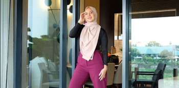 Meski masih baru dalam berhijab, Tya tampak sudah luwes dalam berpakaian dan memadupadankan busananya. Tya mengenakan kerudung warna krem, manset hitam, dan celana ungu yang pas di badannya.